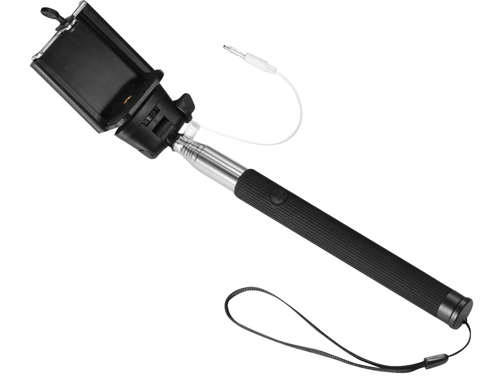 Проводной монопод. Сделайте идеальный селфи с этим выдвижным моноподом (до 90 см). Не требует батареи или использования приложения. Просто подключите 3,5 мм аудио разъем в телефон (совместим со всеми мобильными телефонами IOS) и нажмите на кнопку, расположенную на ручке. Регулируемый держатель телефона подходит для всех смартфонов. Силикон, сталь и ПВХ. Гравировка (оптоволоконный лазер) (Без чернения) на данный товар осуществляется бесплатно. Оплачивается только настройка оборудования в размере 1100 рублей на весь тираж.