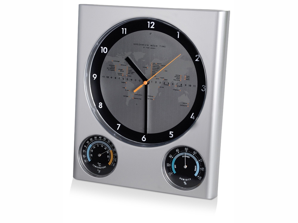 Настенная погодная станция оснащена часами, гигрометром и термометром. На фоне циферблата расположена карта мира. Отличный вариант для подарка коллегам по работе. УФ-печать (УФ-печать цветные изделия) на данный товар осуществляется бесплатно. Оплачивается только настройка оборудования в размере 2000 рублей на весь тираж.