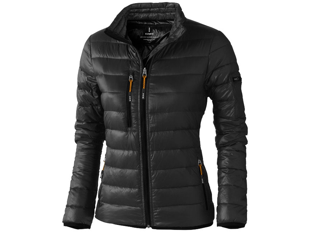 Женская легкая куртка Scotia. Стандартный покрой. Ткань не пропускает пух. Карманы для рук и нагрудный на молнии. Карман на рукаве на молнии можно использовать для нанесения. Резинка на манжетах и внизу куртки. Ремешки на собачку (второй комплект в цвете антрацит). Внутренний противоветровой клапан и защита подбородка. Ткань дышащая, ветронепроницаемая и влагоотталкивающая. Отражающий лого сзади. Легкий пуховик. Ткань из 100% нейлона с матовым и блестящим водоотталкивающим покрытием, 20D. 80% пух и 20% перо. 115 г/м². Термотрансфер (1 цвет (цветные изделия)) на данный товар осуществляется бесплатно. Оплачивается только настройка оборудования в размере 10000 рублей на весь тираж.