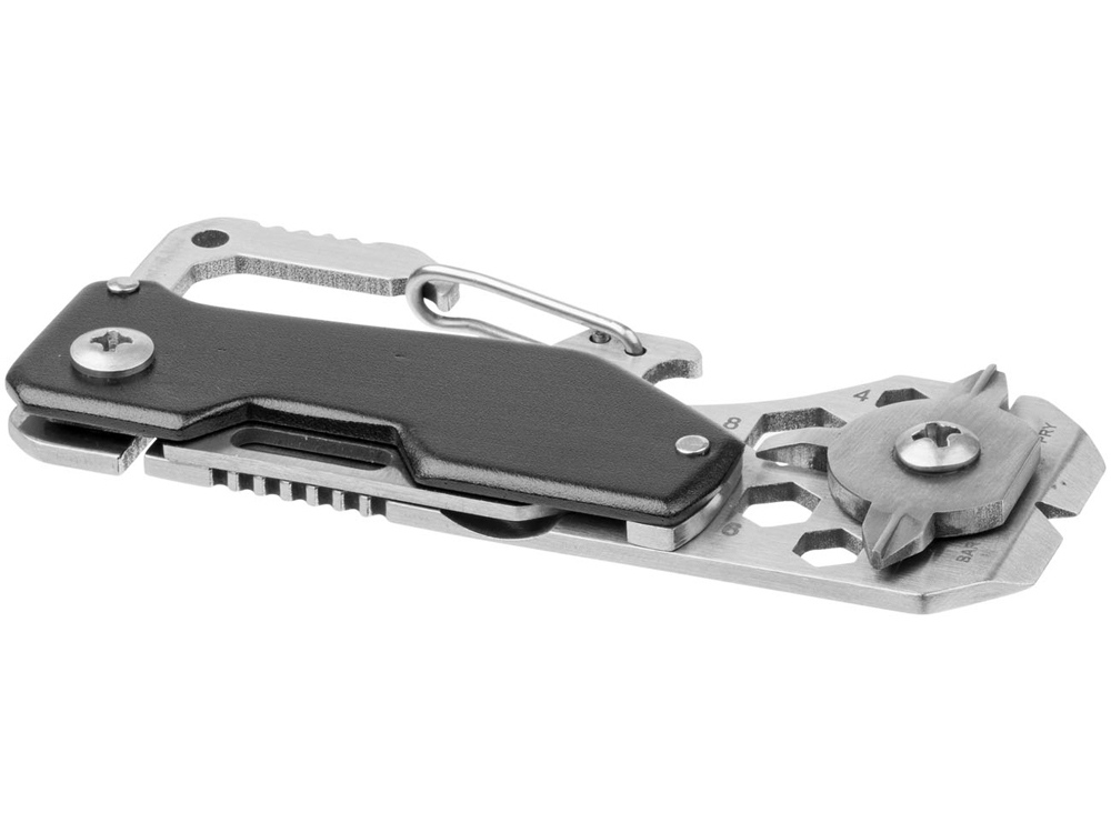 Многофункциональный инструмент Teron. Легкий многофункциональный инструмент с ножиком, карабином, линейкой, открывалкой, 4-мя шестигранными ключами, спицевым ключом, гвоздодером, 1 плоской отверткой, 1 маленькой и 1 большой отвертками Philips. Упакован в подарочную коробку Elevate. Алюминий. Гравировка (оптоволоконный лазер) (Без чернения) на данный товар осуществляется бесплатно. Оплачивается только настройка оборудования в размере 1100 рублей на весь тираж.