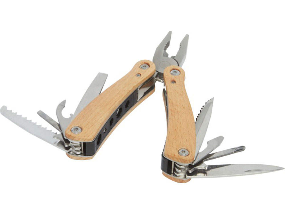 Прочный и долговечный большой многофункциональный инструмент из высококачественной нержавеющей стали с ручками из буковой древесины. Это обязательный инструмент для любого скаута, мастера и любителя отдыха на природе. Имеет 12 функций: плоскогубцы с большими концами, стандартные плоскогубцы, кусачки, зазубренное лезвие, средний нож, крестообразная отвертка, открывалка для бутылок и банок, плоская отвертка, плоская отвертка среднего размера, пила и напильник, очиститель напильника. Используемая буковая древесина поступает от надежных поставщиков, соблюдающих все экологические и социальные нормы. Размер в открытом состоянии 15 x 6,5 см, а в закрытом — 9,8 x 4,7 см. Поставляется с инструкцией по эксплуатации и упакован в подарочную коробку из переработанного картона размером 12 x 7 x 2,5 см.