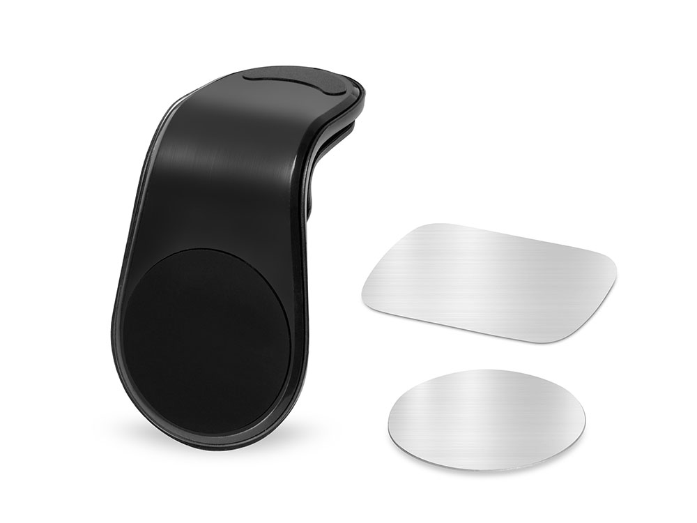 Магнитный держатель для телефона крепится к вентиляционной решетке автомобиля при помощи прищепки, которая снабжена прорезиненными вставками для плотного сцепления с поверхностью. Также в комплекте идут 2 самоклеящиеся стальные пластины. Они крепятся к смартфону.