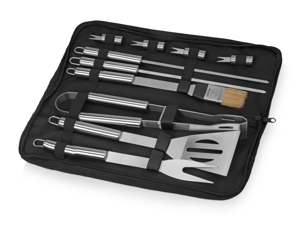 Практичный и функциональный набор для любителей барбекю и шашлыков на природе. В компактной упаковке богатое содержимое: щипцы, лопатка, вилка, кисточка, шампура, шпажки для шашлыка. Прекрасное дополнение ко всем праздникам и посиделкам на природе. Гравировка (оптоволоконный лазер) (Без чернения) на данный товар осуществляется бесплатно. Оплачивается только настройка оборудования в размере 1100 рублей на весь тираж.
