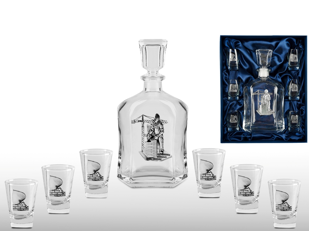 Отличная идея для подарка руководителям строительных фирм. Набор для водки включает в себя стеклянный штоф и 6 стопок задекорированных в строительной тематике. Набор аккуратно упакован в подарочный футляр. Шильд спектрум (Шильд спектрум) на данный товар осуществляется бесплатно. Оплачивается только настройка оборудования в размере 1100 рублей на весь тираж.