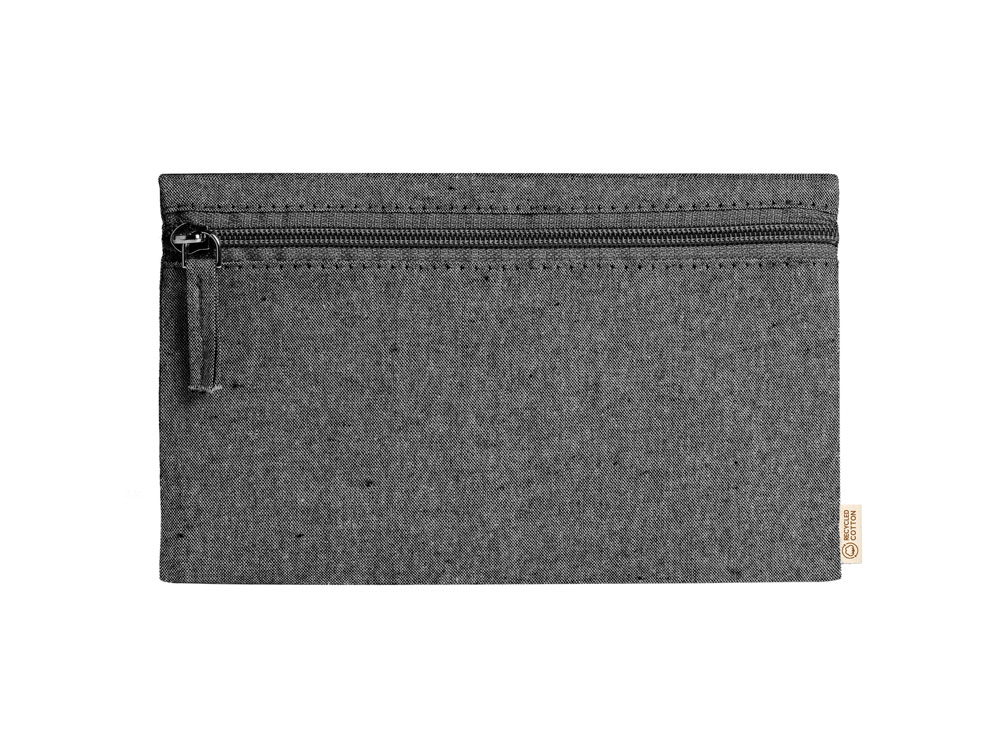 Универсальная косметичка из переработанного хлопка с застежкой-молнией в тон. Трафаретная печать (1 цвет (цветные изделия)) на данный товар осуществляется бесплатно. Оплачивается только настройка оборудования в размере 10000 рублей на весь тираж.