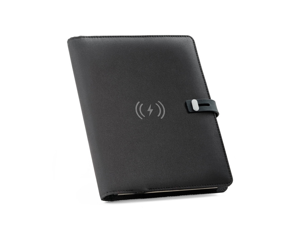 Папка формата A5 из rPET 300D со встроенным беспроводным зарядным устройством. Аккумулятор с емкостью 5000 мАч, мощность 5 Вт, вход/выход 5 В/2,1 А и кабель USB типа C для зарядки. Папка содержит внутренний карман для смартфона до 6,5'', 3 слота для карт, 4 светодиода, кнопку включения/выключения, держатель для ручки (ручка не входит в комплект), USB-кабель, блокнот с черной картонной обложкой и 64 страницами цвета слоновой кости, полученных в результате устойчивого лесопользования. На передней панели также есть овальная печать черного цвета, обозначающая зону беспроводной зарядки. Поставляется в картонной подарочной упаковке.