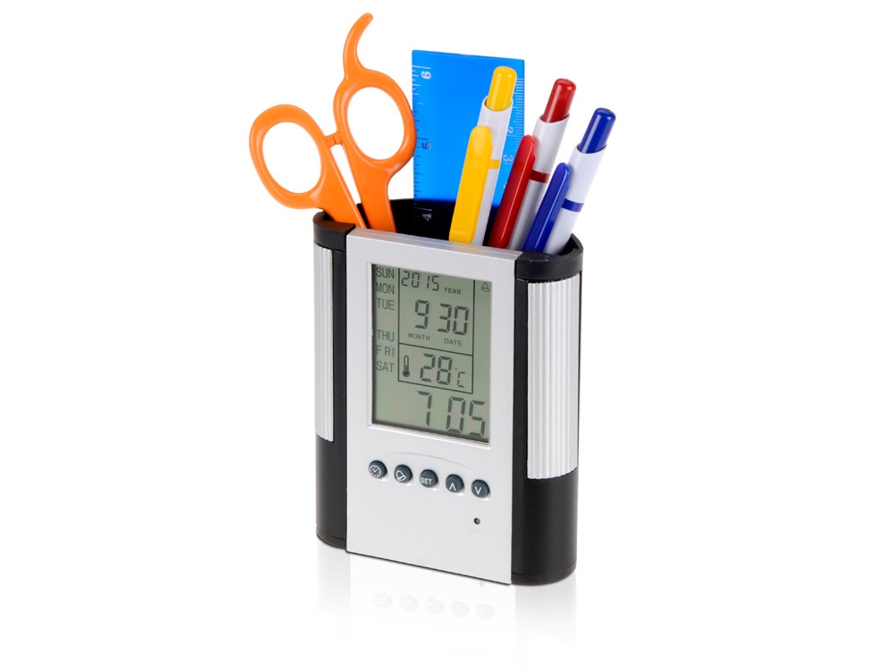 Чрезвычайно практичный элемент Вашего рабочего стола подскажет время, температуру и даже дату, а ещё вместит в себя канцелярские принадлежности. Часы оснащены будильником. Полный порядок на столе плюс комфорт за приемлемую цену. Тампопечать (1 цвет (цветные изделия)) на данный товар осуществляется бесплатно. Оплачивается только настройка оборудования в размере 8200 рублей на весь тираж.