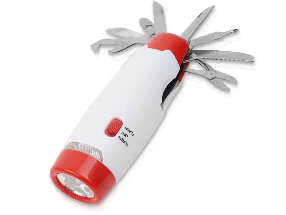 Замечательный фонарик-мультиинструмент дает яркий световой поток синего и красного цветов. Фонарик станет прекрасным и незаменимым помощником во время похода. Тампопечать (1 цвет (белые изделия)) на данный товар осуществляется бесплатно. Оплачивается только настройка оборудования в размере 4000 рублей на весь тираж.