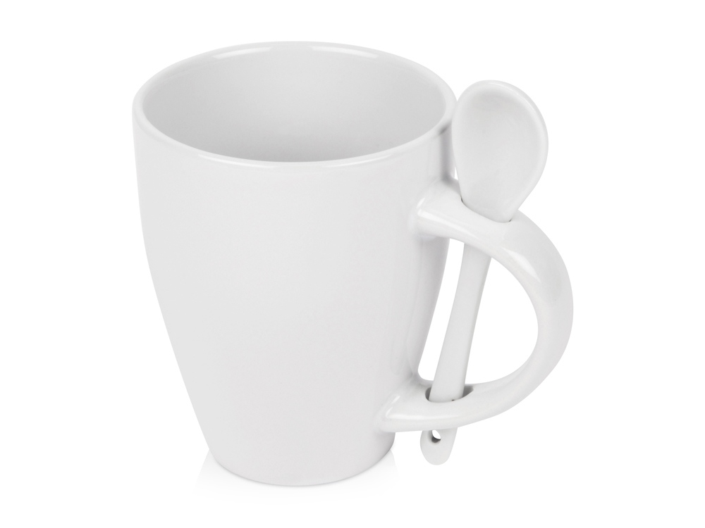 Стильная кружка на 320 мл с ложкой выполнены в контрастном сочетании цветов. Оригинальная форма ручки кружки позволяет крепить в ней ложку. Замечательный подарок для коллег по работе. Тампопечать (1 цвет (белые изделия)) на данный товар осуществляется бесплатно. Оплачивается только настройка оборудования в размере 7300 рублей на весь тираж.