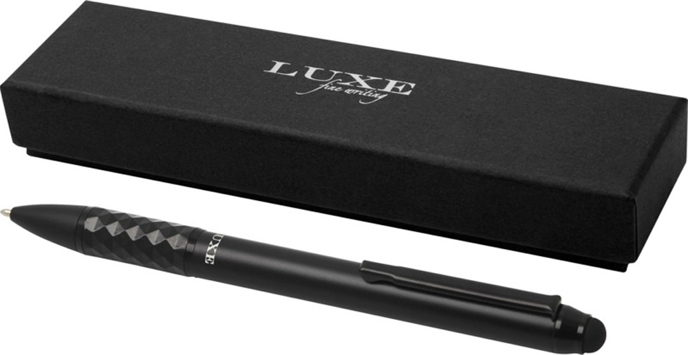Шариковая ручка со стилусом и эксклюзивным дизайном сочетает в себе шикарный внешний вид и надежность. Корпус эргономичен для использования. Ручка заправлена черными чернилами и упакована в подарочную коробку LUXE. Ее можно дополнить перьевой ручкой или ручкой-роллером и использовать в качестве подарочного набора. Алюминий.