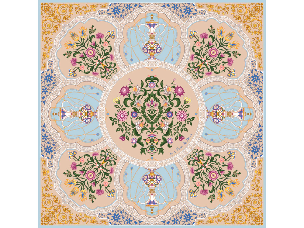 Платок Сады Востока от бренда Русские в моде” by Nina Ruchkina посвящен экзотической красоте, женской привлекательности и очарованию. В центре полотна расположились цветы дивного сада, олицетворяющие собой процветание, мир и земную любовь. Рядом изображены кувшины, наполненные росой молодости и секретами вечно цветущих восточных красавиц.